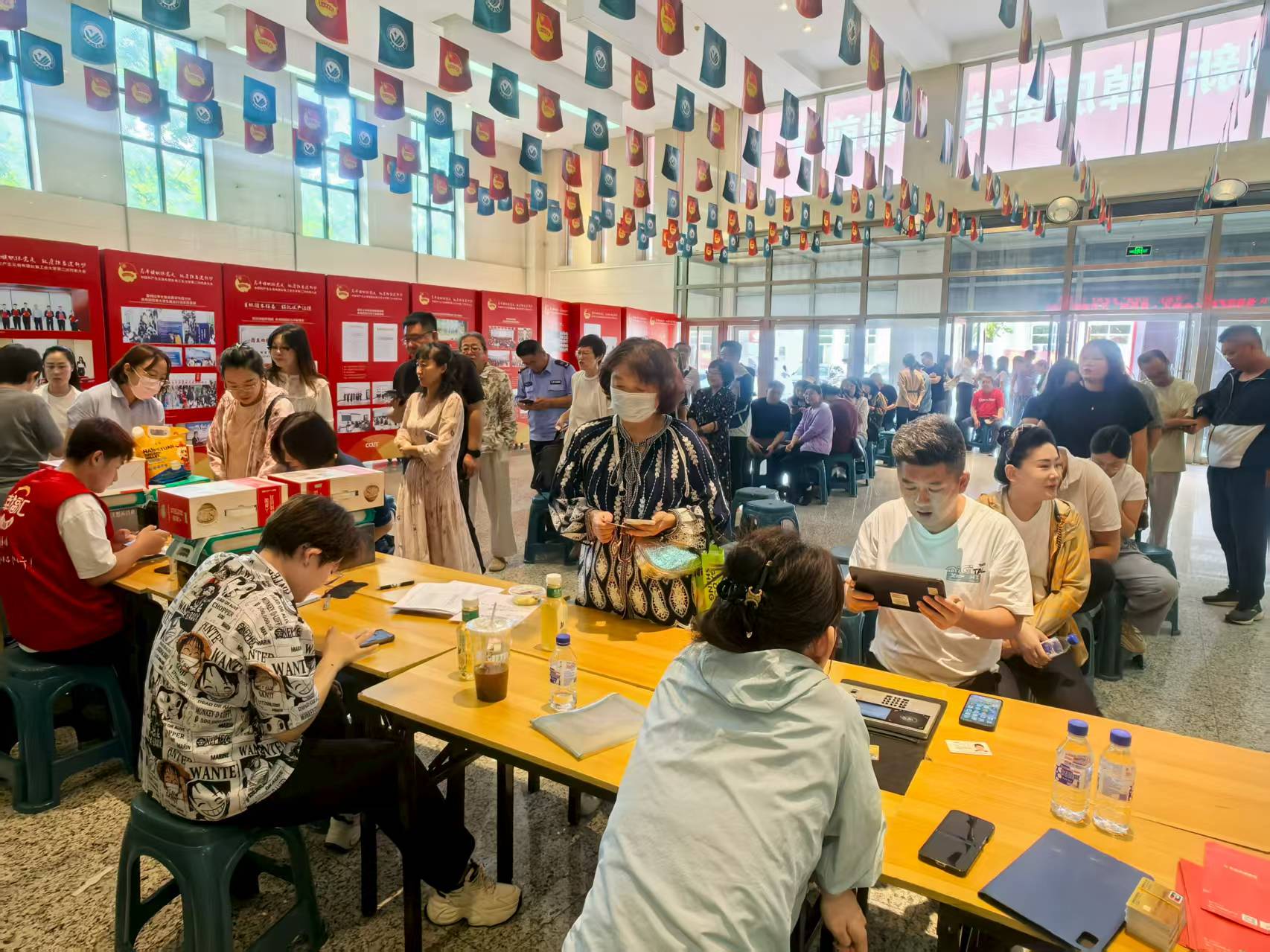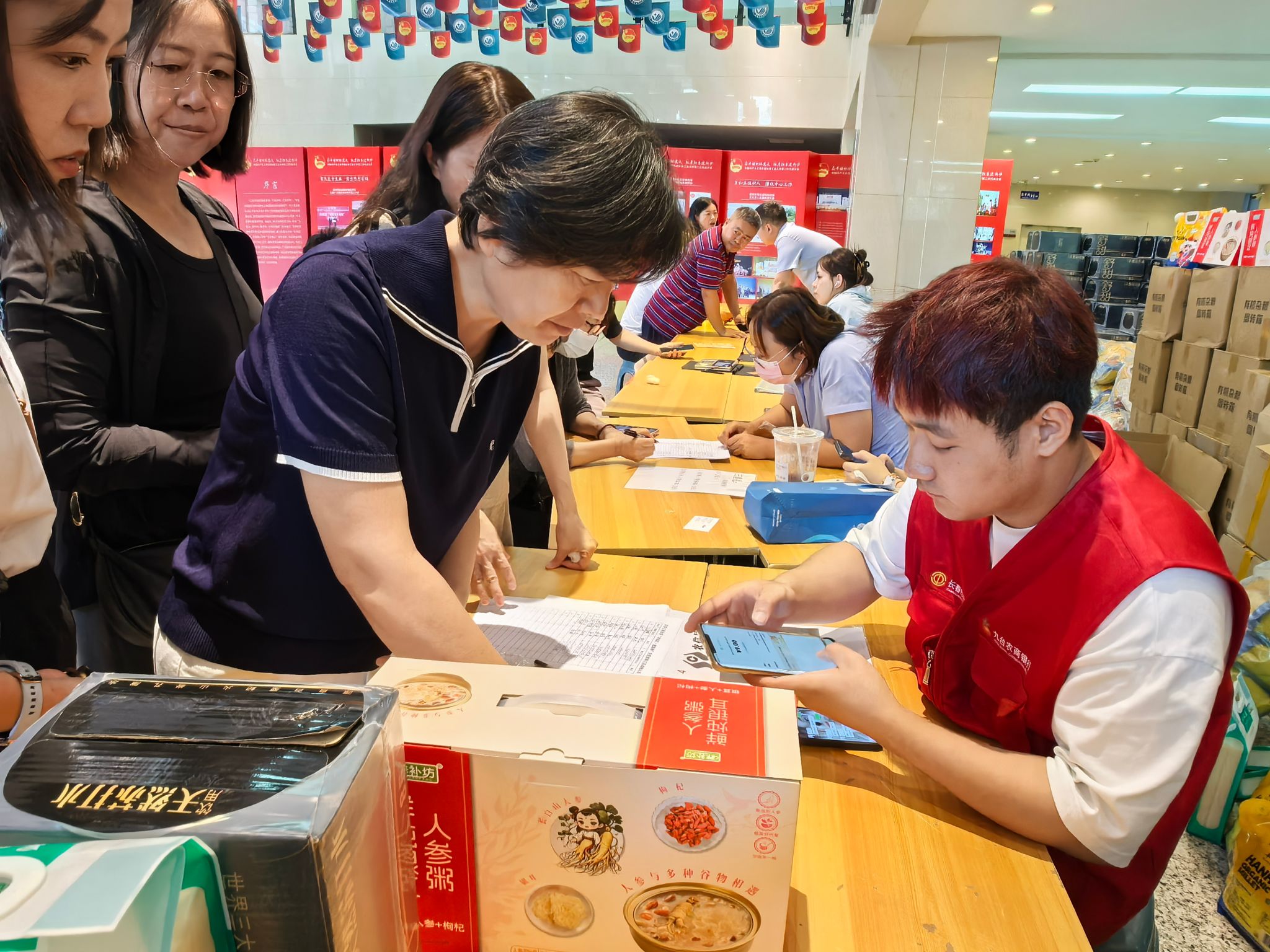活动吸引了全校广大教职工的踊跃参与,现场气氛十分热烈。大学生活动中心一楼大厅内人头攒动,欢声笑语不绝于耳。校工会工作人员和银行专员全程驻场,及时解答老师们在绑卡、支付过程中遇到的各类问题,确保每一位符合条件的老师都能顺利参与活动。老师们在工作人员的引导下,有序通过“云闪付”APP完成扫码、领券、支付等流程。仅需支付1元,即可兑换一整箱苏打水;支付9元,就能带走五斤装的有机米面或一箱人参粥。实物礼品实用又优质,老师们纷纷表示“活动很实在、很暖心”。据统计,300余名教职工成功参与并兑换了节日活动福利。