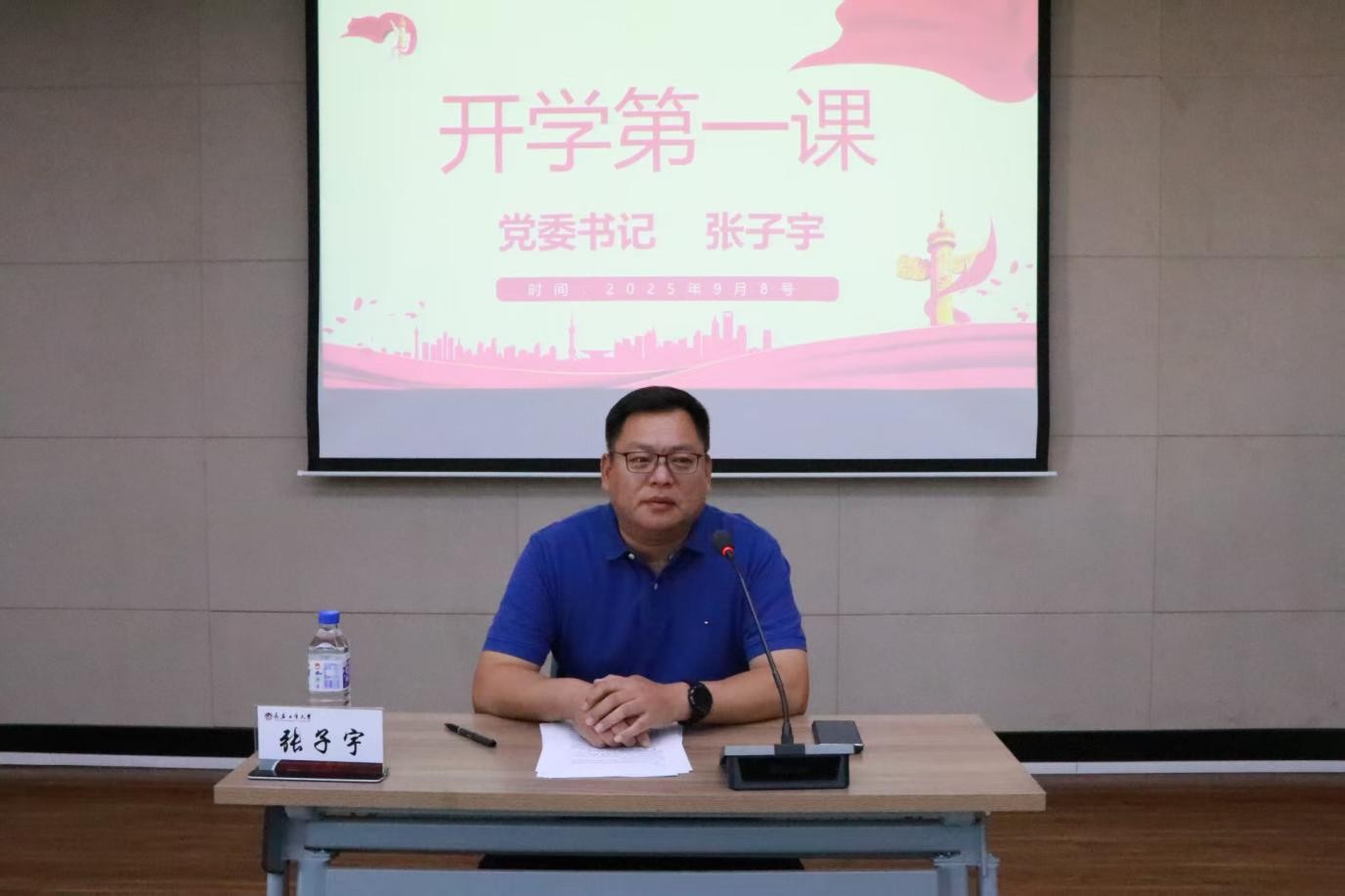 本网讯(通讯员 袁雪妍)为助力2025级新生明确征程方向、以初心校准大学航向、用担当开启成长新程,9月8日,外国语学院党委书记张子宇在学院多功能报告厅,为新生讲授“开学第一课”:校史润初心,担当启新程。