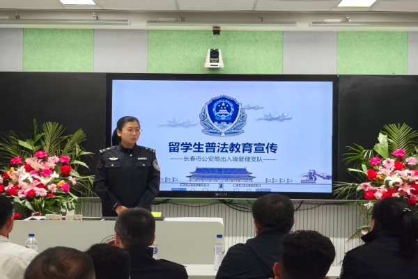 (通讯员 闫妍 杜柏权)为筑牢校园安全防线,增强留学生法律意识,9月23日上午,国际教育学院联合安全工作处、长春市公安局出入境管理支队,为2025级留学生举办了一场别开生面的普法教育宣讲会。长春市公安局出入境管理支队外国人事务管理科科长杜杰、涉外案件科宋洋、长春市公安局治安支队刘昊、安全工作处处长冯晓滨、驻校警务专员王平、国际教育学院党委书记季宏伟、国际中文教育中心主任杜柏权及2025级留学生参加了本次宣讲会。此次宣讲会不仅是一次法治教育,更是“警校联动”机制在涉外安全管理中的创新实践。