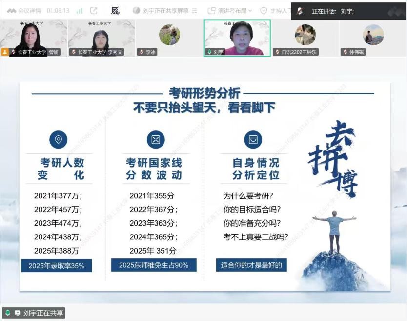李冰首先致辞,对长春工业大学外国语学院组织此次宣讲会表示热烈欢迎和衷心感谢。同时鼓励在线同学认真聆听、积极互动,充分利用宝贵机会做好考研准备。