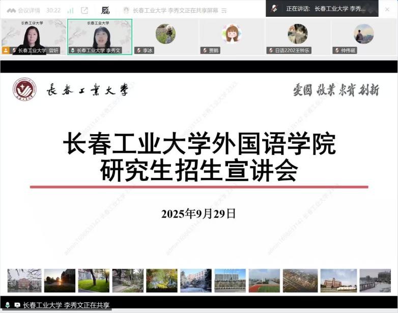 本网讯(通讯员 贾 鹤)为帮助学生明晰考研方向,破解备考信息差,9月29日,长春工业大学外国语学院联合吉林化工大学外国语学院,举办了线上考研宣讲会。学院院长李秀文、副院长曾妍、英语系主任刘宇参加了会议,吉林化工大学外国语学院副院长李冰主持会议。