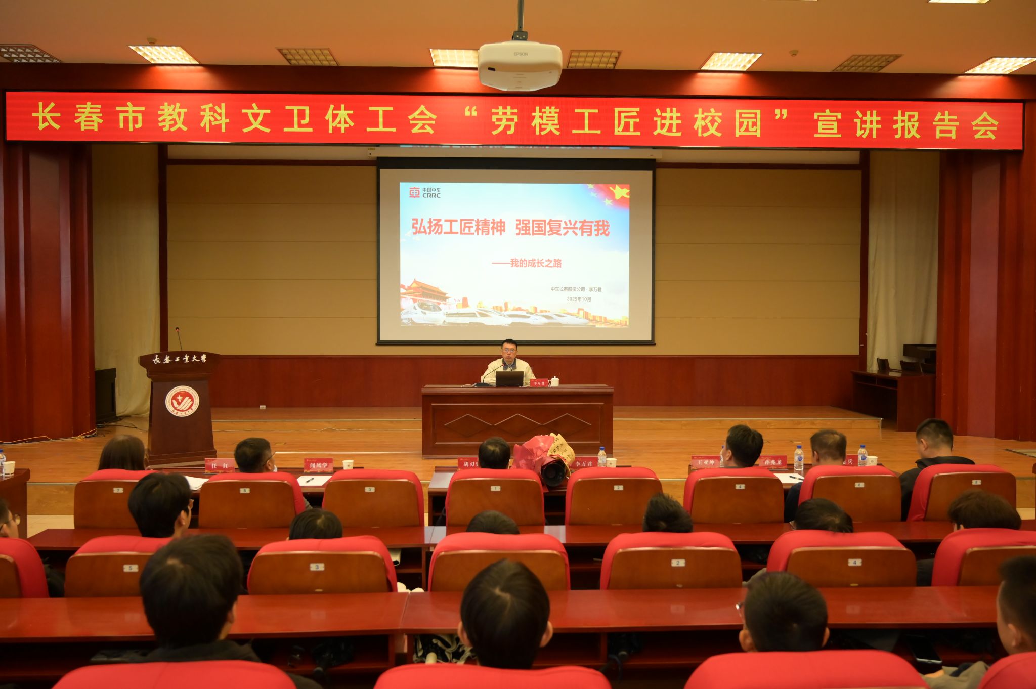 本网讯(通讯员 刘子晴 张宁) 为大力弘扬劳模精神、劳动精神、工匠精神,充分发挥劳模工匠对青年大学生的榜样引领作用,10月17日下午,由长春市教科文卫体工会主办,校工会、党委学生工作部承办的“劳模工匠进校园”(长春工业大学专场)宣讲报告会在我校南湖校区学术报告厅圆满举办。本次活动特邀“大国工匠”、全国劳动模范、全国优秀共产党员、“感动中国”年度十大人物、中车长春轨道客车股份有限公司高级技师李万君走进工大校园,为师生作专题报告。