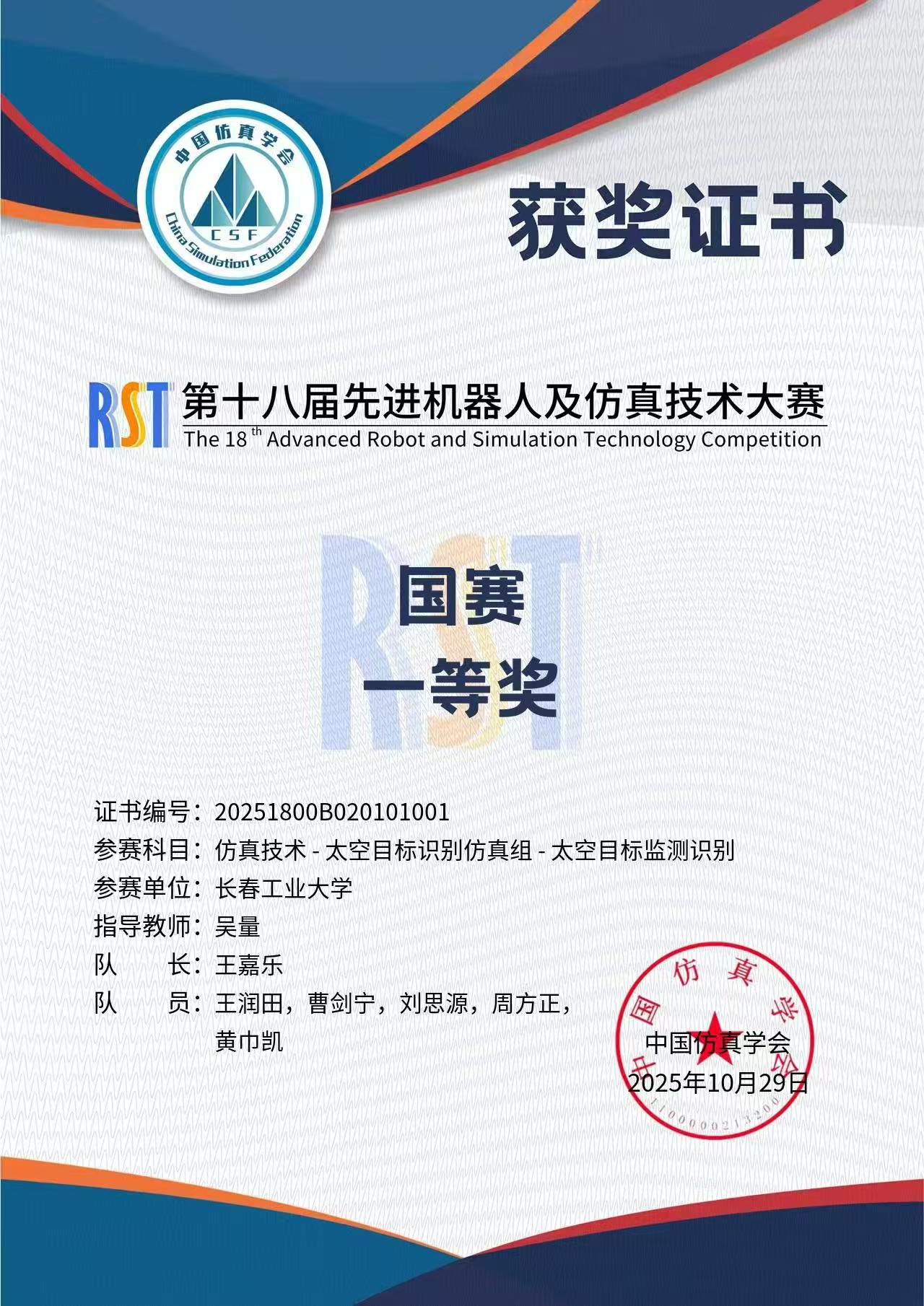 本网讯(通讯员 吴量)2025年10月29日,由中国仿真学会、北京航空航天大学联合主办的第十八届先进机器人及仿真技术大赛太空目标识别仿真组全国总决赛在北京航空航天大学圆满落幕。经过激烈角逐,我院空间信息光电测量与感知团队的研究生代表队凭借扎实的理论功底、卓越的创新设计和高效的团队协作,荣获全国一等奖,充分展示了我院在航空航天领域的创新能力与人才培养成果。