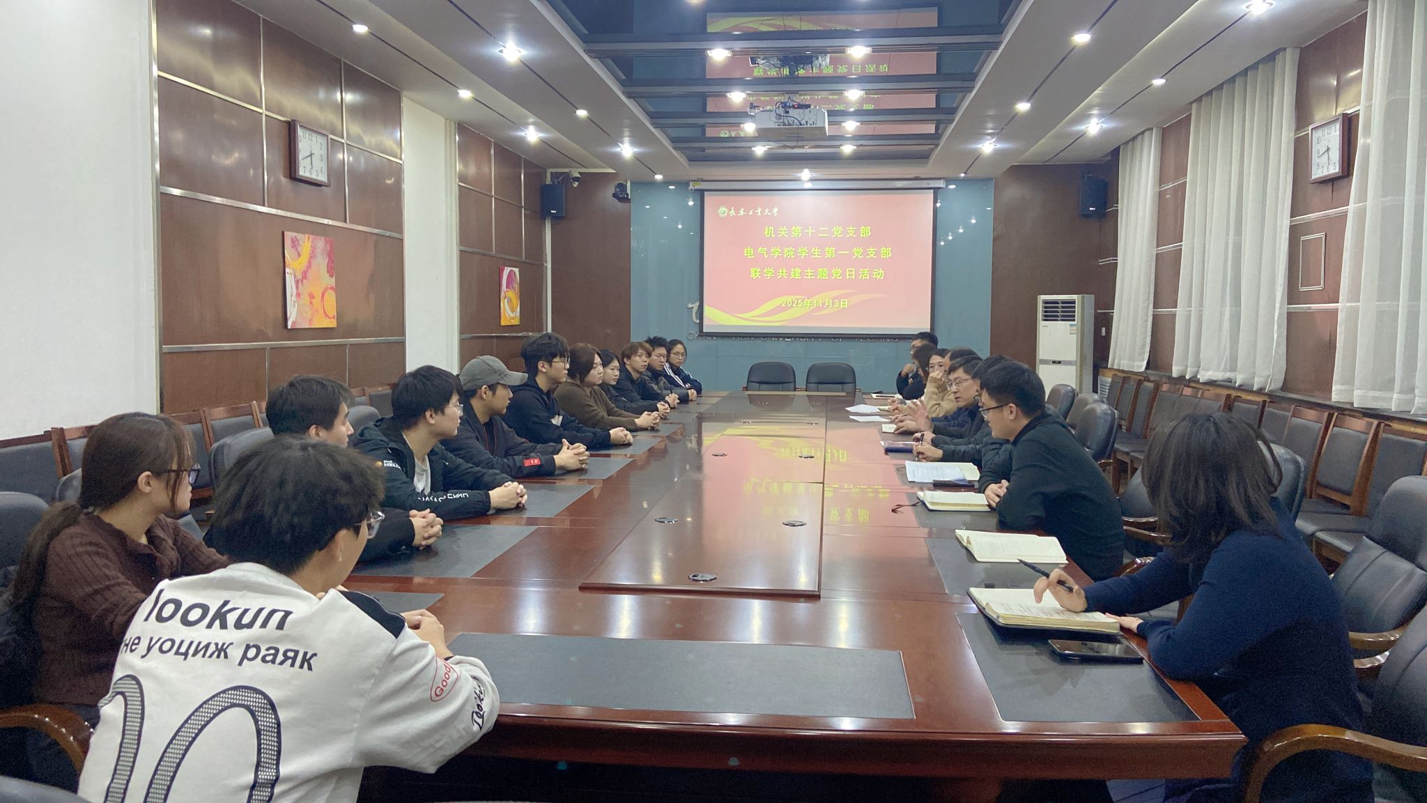(通讯员:张聪)为推动机关职能部门深入基层,党建和业务工作深度融合,11月3日,机关第十二党支部与电气学院学生第一党支部联合开展“携手共进 规划未来”主题党日活动。本次活动通过观看微视频、专题党课、交流研讨等形式,旨在加强思想引领,解决学生实际困难,助力学生成长成才。