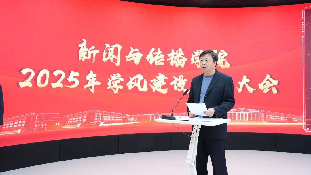 本网讯(通讯员 王权文)2025年12月17日,新闻与传播学院在艺术楼美育空间召开2025年学风建设表彰大会,共同见证优秀学子风采,凝聚学风建设合力。校党委副书记吴成章、党委学生工作部部长孙兆龙、招生就业处处长付宏波、校团委书记邵捷等领导出席大会并为受表彰集体和个人颁奖。学院党委书记矫东海、院长管媛辉、党委副书记薛勇、副院长张守伟以及各系党支部书记、主任、全体辅导员、部分师生代表参加大会。大会由学院党委副书记薛勇主持。