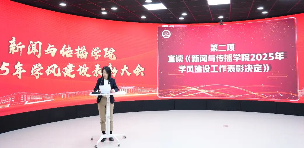 学院院长管媛辉宣读《关于表彰新闻与传播学院2025年度学风建设先进集体和优秀个人的决定》,大会随后进入颁奖环节。