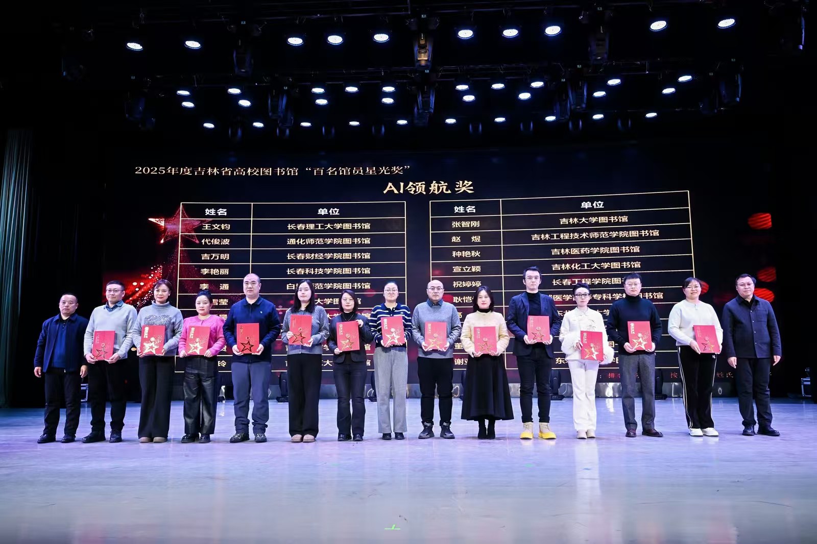 “百名馆员星光奖”设立旨在展现新时代图书馆员的精神风貌与职业担当,通过多维度评审机制,表彰在资源建设、读者服务、文化传承、学术研究等领域有突出贡献的行业标兵。我校图书馆馆长姜兰获得“杰出贡献奖”,技术保障部主任吴天昊获得“AI领航奖”,读者服务部主任张红兵、流通阅览部主任孙红岩获得“服务之星奖”。