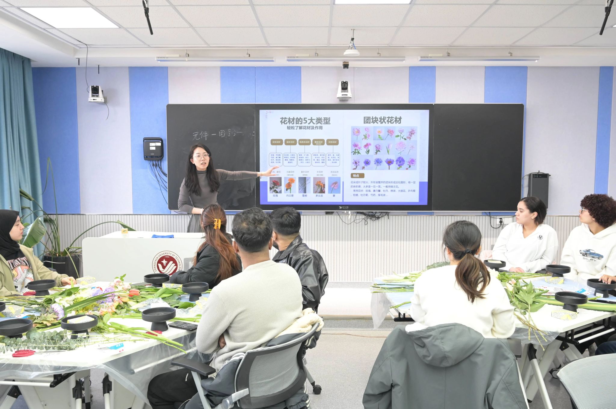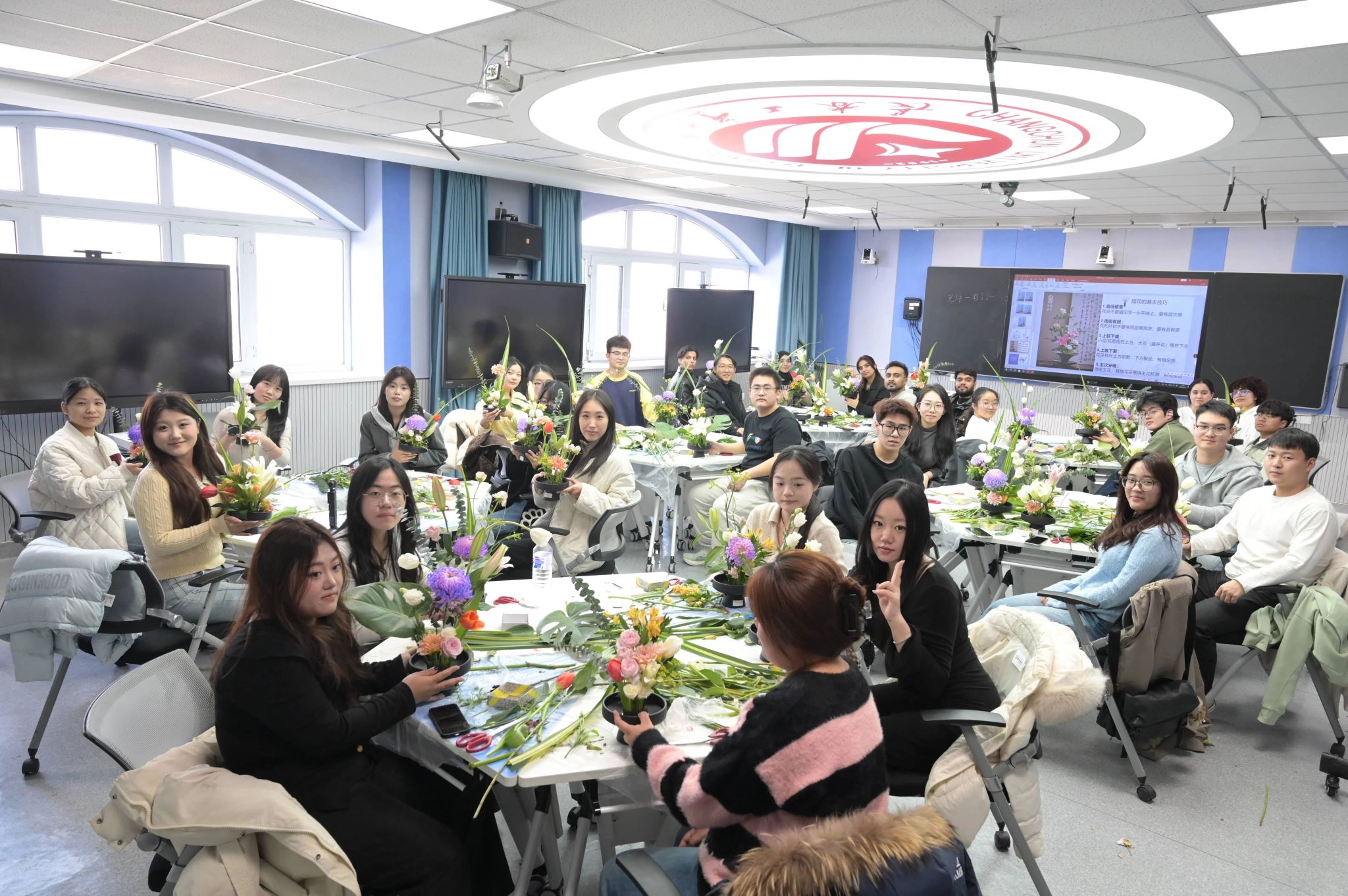 同学们全情投入、动手实践,大家相互交流、切磋技艺,现场氛围温馨而热烈。每位同学都完成了独具春日意趣的原创插花作品,脸上洋溢着成就感与幸福感。参与活动的留学生们也纷纷表示:在亲手插花的过程中,不仅沉浸式体验了中国传统节气文化与东方花艺的雅致意境,更在一花一叶的搭配中感受到中式美学的独特魅力。