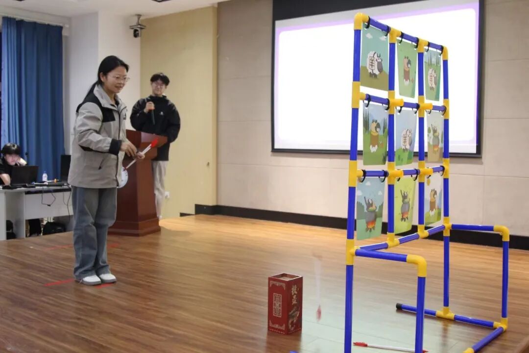 活动伊始,各小组同学有序参与投壶互动,大家手持箭矢、凝神定气,瞄准壶口轻掷而出,箭矢入壶后,进入心理知识答题环节,各小组积极讨论、踊跃作答。通过投壶与答题环节交替进行,同学们不仅有效舒缓了情绪,更加深了对心理健康知识的理解与掌握。