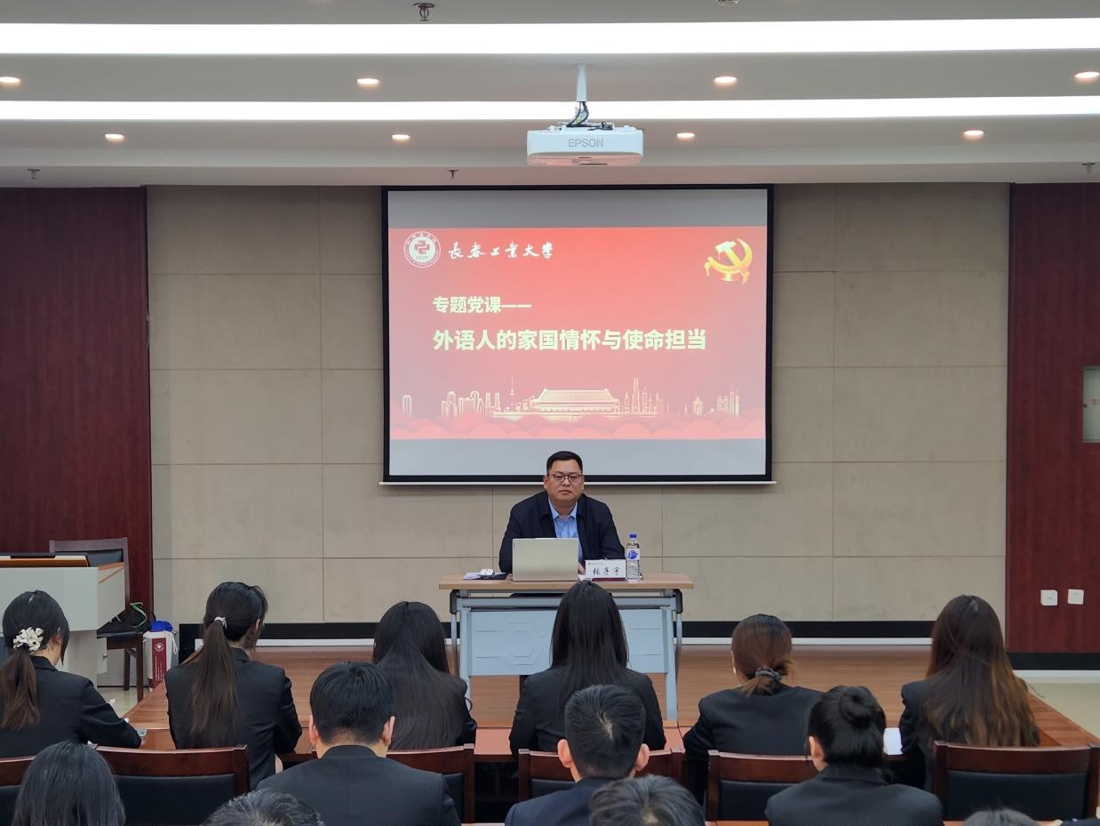 本网讯(通讯员 孙奕涵 )为进一步厚植青年学子家国情怀,强化新时代外语人的责任意识与使命担当,引导广大师生党员、入党积极分子坚定理想信念、锤炼党性修养,3月25日,外国语学院在学院多功能报告厅举办“外语人的家国情怀与使命担当”专题党课。本次党课由学院党委书记张子宇主讲,学院师生党员代表、入党积极分子及党员发展对象共同参加学习。
