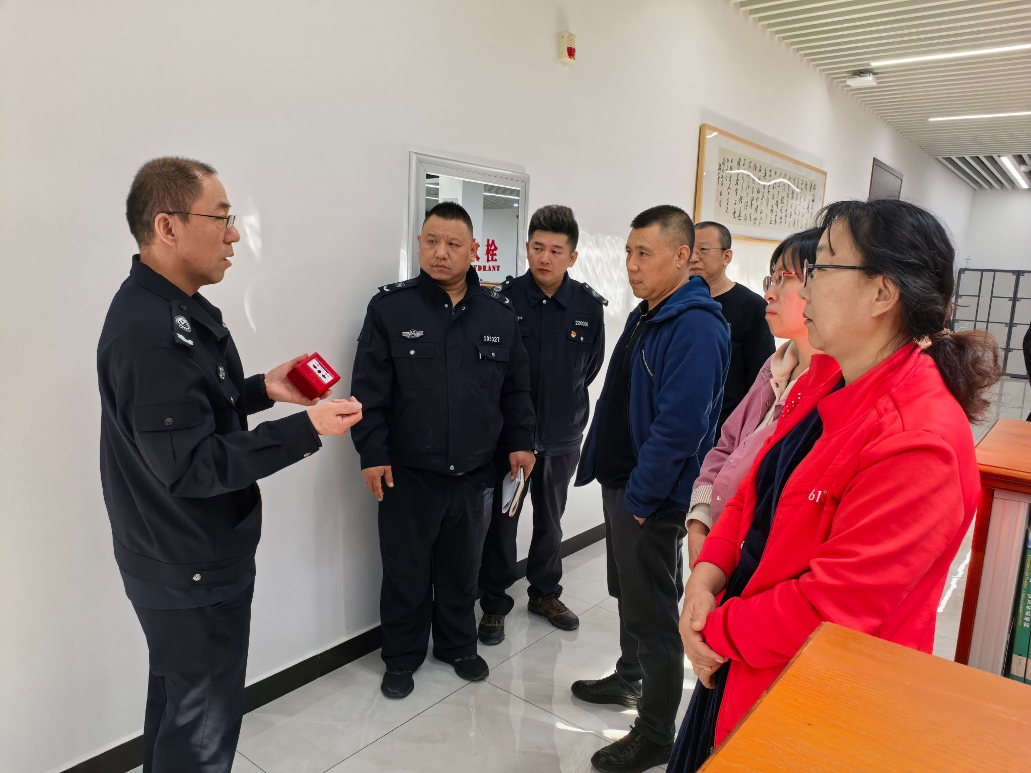 理论学习结束后,培训进入实操环节。来自保卫处的专业工作人员针对图书馆的环境特点,详细讲解了灭火器的适用场景及操作要领,重点演示了“提、拔、握、压”四步操作法,并强调了站在上风口、对准火焰根部喷射等关键细节。随后,工作人员还演示了消火栓的使用方法,讲解了不同类型火灾的扑救策略和注意事项,使馆员们对消防器材的应用有了更全面的了解。最后,在工作人员的引导下,馆员们按照预定疏散路线来到一楼消防安全出口,工作人员现场讲解消防安全门的使用和紧急情况下的处置办法。