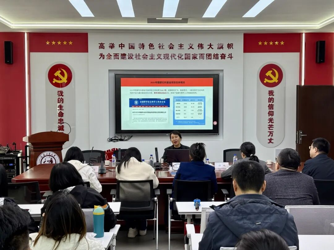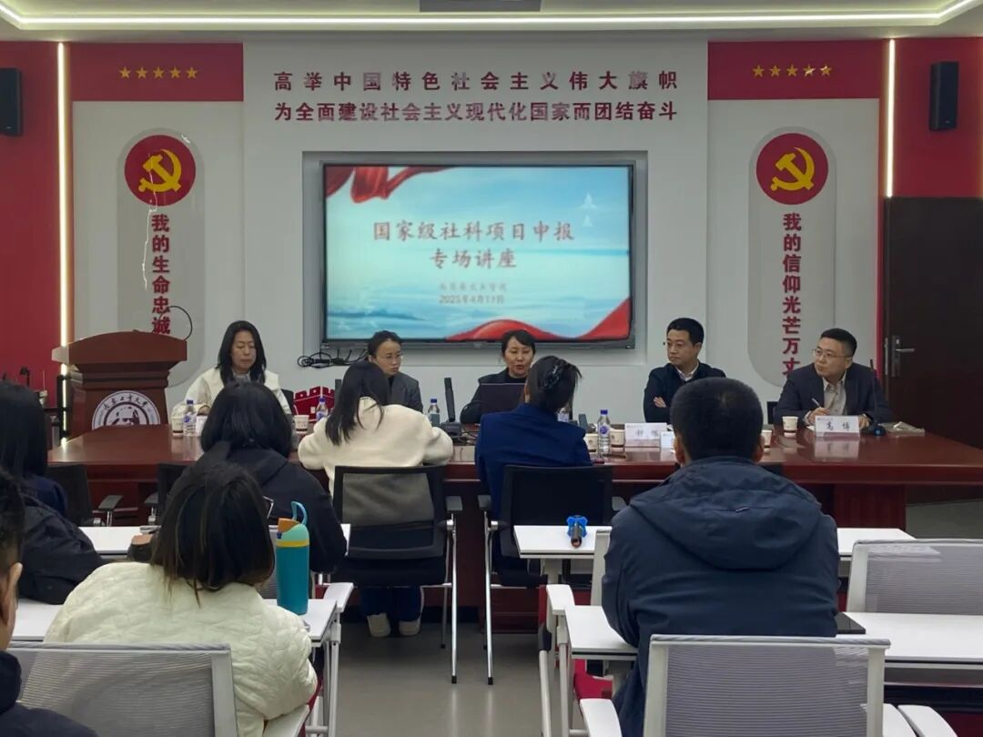 为深入贯彻落实党中央关于高等教育与哲学社会科学高质量发展的决策部署,进一步提升学院教师科研创新能力,精准助力国家级科研项目申报工作,4月10日,马克思主义学院在学校党委的全面指导和学校科研处的大力支持下,在学院会议室成功举行国家级社科项目申报专场讲座。学校科研处相关负责人、学院班子成员、部分教研室主任和党支部书记、青年骨干教师参加本次活动。