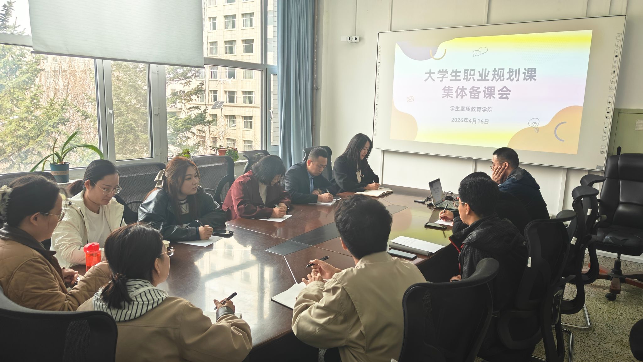 备课会上,赵爽老师紧扣职业规划课程核心定位,结合当前大学生职业认知现状、就业市场发展趋势及学生成长需求,从课程内容梳理、教学重难点突破、课堂互动设计等方面展开详细讲解。他针对课程教学流程、课程考核标准、教学材料归档等关键工作提出明确要求,重点围绕如何将职业规划理论与学生实际生涯规划相结合、如何激发学生主动规划意识、如何提升课程的针对性和实用性等问题,分享了实操经验与教学思路。与会教师认真记录、深入研讨,积极交流教学中的难点困惑与创新做法,现场互动热烈、研讨氛围浓厚,切实达到了凝聚共识、取长补短、共同提升的备课目的。