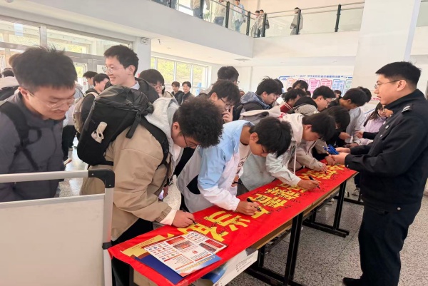 在南湖校区科研楼大厅开展的学生签名活动,成为本次系列活动的亮点之一。活动现场,“国家安全在我心,吾辈青年当奋进”的签名横幅整齐铺开,吸引了大批学生驻足参与。同学们手持签字笔,郑重地在横幅上签下自己的名字,每一笔都承载着青年学子维护国家安全的责任与担当,每一个签名都彰显着守护家国安宁的坚定决心。同学们纷纷表示,通过参与此次活动,更加深刻地认识到维护国家安全的重要意义,也明确了作为新时代大学生的责任使命,今后将主动学习国家安全知识,自觉抵制危害国家安全的行为,积极向身边人宣传国家安全理念,用实际行动守护国家利益。