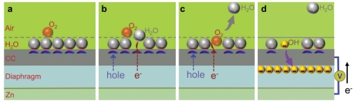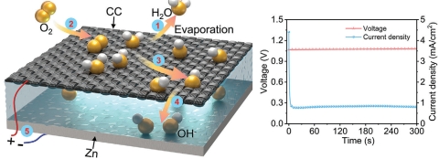 课题组开发了基于Zn–碳布不对称结构 的水伏发电装置,揭示了由“蒸发电势(Evaporating Potential)”主导的能量转换机理。研究表明,水分子在蒸发过程中会扰动碳材料表面电荷分布,产生局部电子密度变化;被激发的电子与界面水分子、氧气发生反应生成OH⁻,在金属电极与碳电极之间形成稳定的离子迁移与电流输出。器件仅依靠水与空气即可持续工作,功率密度高达142.72 μW/cm²,可兼容多种金属电极(Cu、Al、Fe等)。3个单元可驱动计时器,8个单元即可点亮电子表,展现出优异的实用性与环境适应性。
