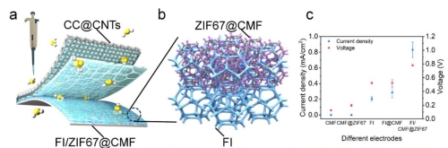 为解决传统电极阻碍水蒸发、器件依赖单向蒸发方向的问题,课题组提出“全泡沫不对称电极”设计,开发出方向无关的HEG(hydrovoltaic electricity generator)。器件以泡沫铁为基底,复合ZIF-67(金属有机框架材料)与碳化三聚氰胺泡沫形成FI/ZIF67@CMF阴极,CNTs修饰碳布为阳极,三聚氰胺泡沫为分隔层,构建全泡沫结构。