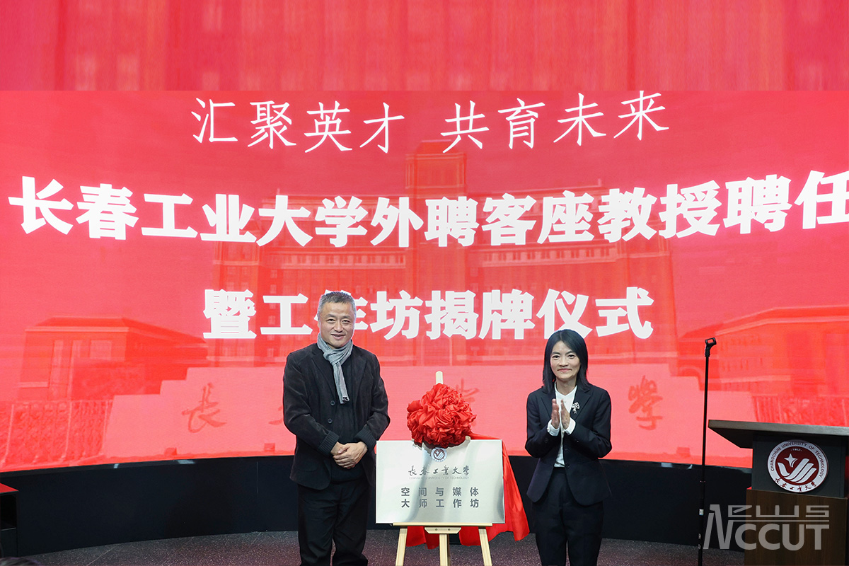 仪式上,付跃刚为唐克扬颁发客座教授聘任证书。唐克扬与新闻与传播学院院长管媛辉共同为长春工业大学“空间与媒体大师工作坊”揭牌。随后,唐克扬致辞对学校的聘任表示感谢,并介绍了自己的专业方向和研究心得,他表示今后在教学、科研、指导学生、工作坊建设等方面为学校的发展作出贡献。