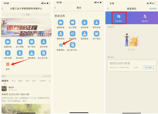 进入教发中心后,选择“更多”进入二级页面。选择“教室预约”--选择“开始预约”如图。