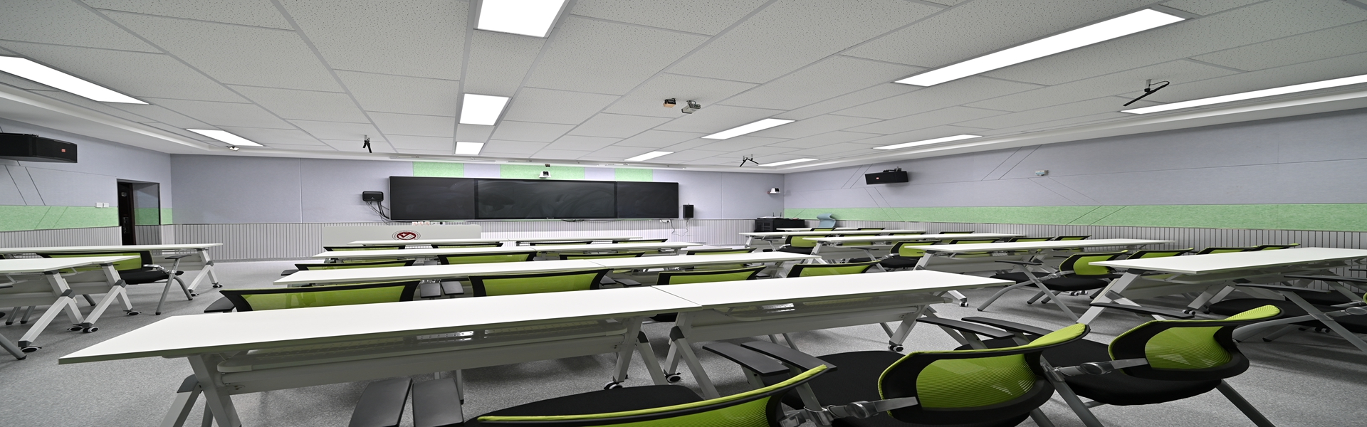 功能:可容纳78人,可移动长条桌椅,开展中班授课、观摩示范课等教学活动及实现课堂教学实录等功能。