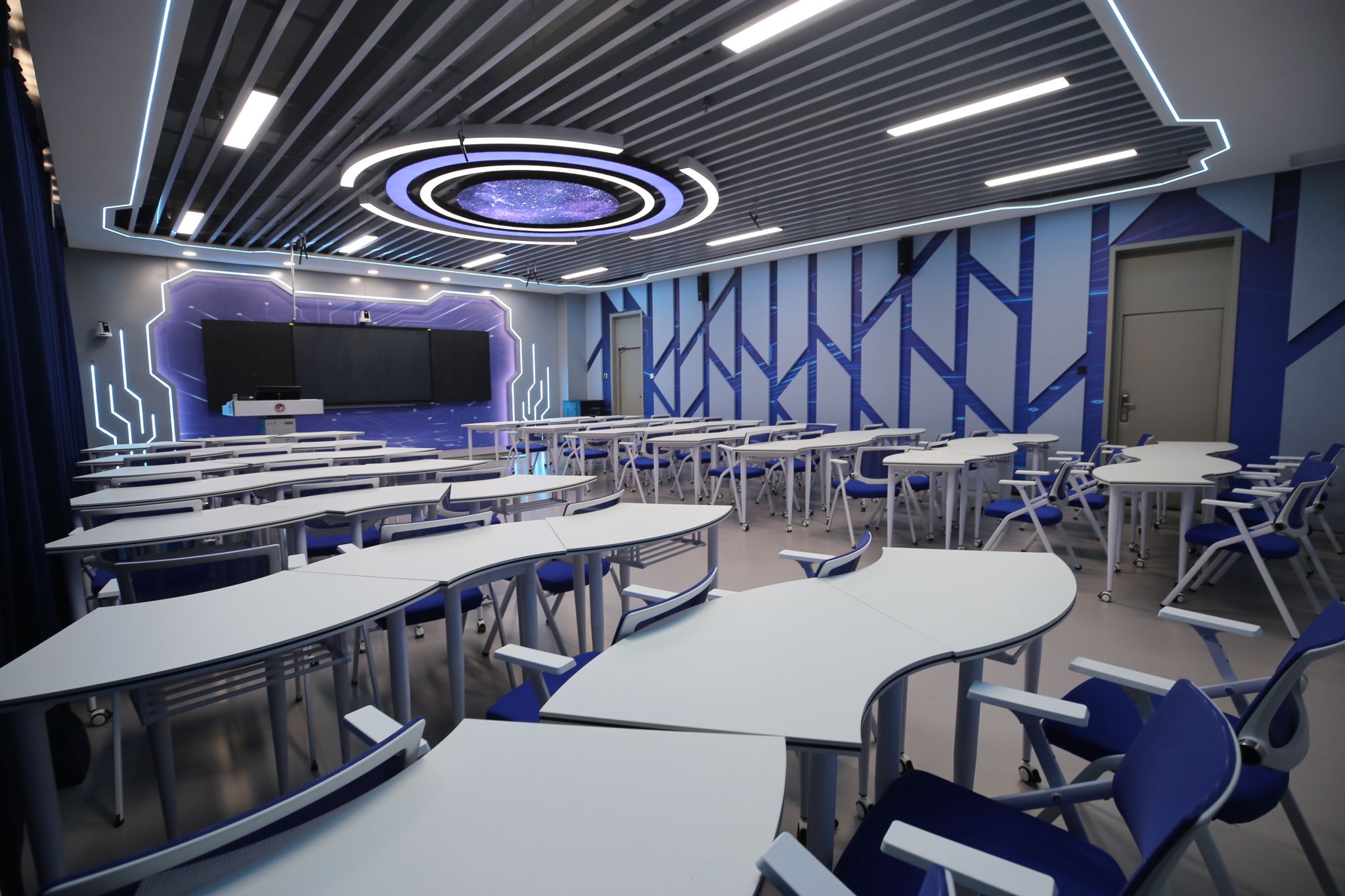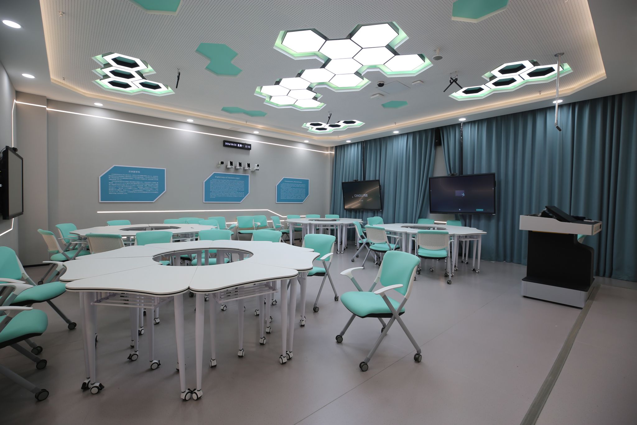 功能:可容纳49人,可移动长条桌椅,开展小班授课、观摩示范课等教学活动及实现课堂教学录播等功能。