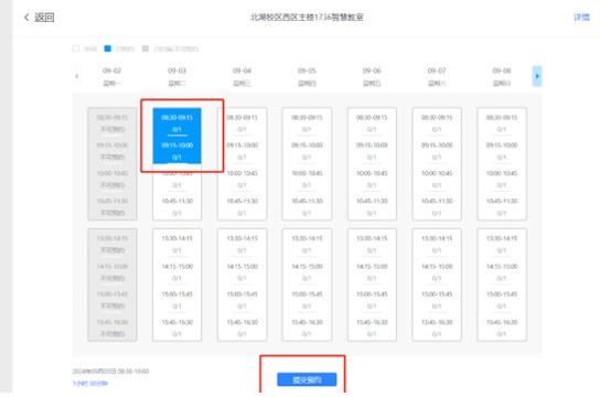 点击需要选择的“智慧教室”进行时间段的预约,填写详细的申请事由后提交预约即可。如图