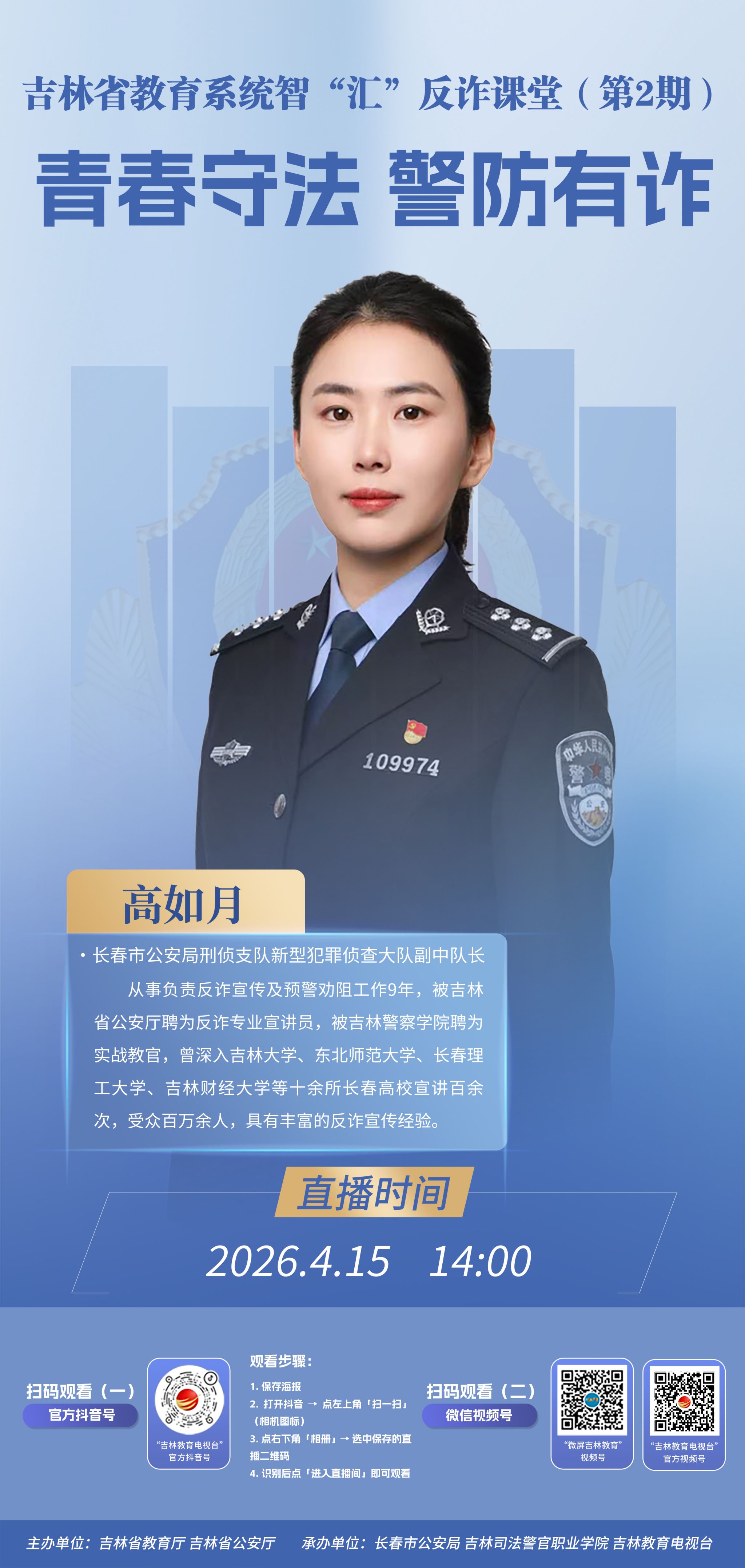 为深入贯彻落实省教育厅、省公安厅关于校园安全工作的部署要求,切实提升全校师生反诈防范意识与识骗、防骗、拒骗能力,织密筑牢校园反诈安全防护网,守护师生财产安全,营造安全、和谐、有序的校园环境,吉林省教育厅、吉林省公安厅联合举办“智‘汇’反诈课堂”线上直播活动。现将有关事项通知如下: